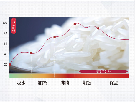 针对吸水、加热、沸腾、焖饭、保温五个阶段,全程精准控温,为米饭每个烹煮阶段配置合适火力。 解决了传统电饭煲煮饭口感不佳、营养流失的问题。