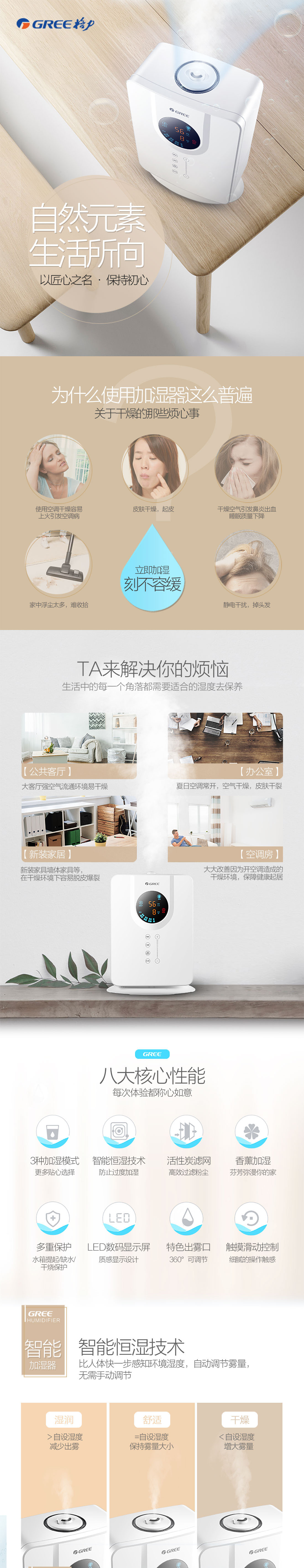 大容量5L水箱;智能恒湿技术;3种加湿模式;香薰加湿