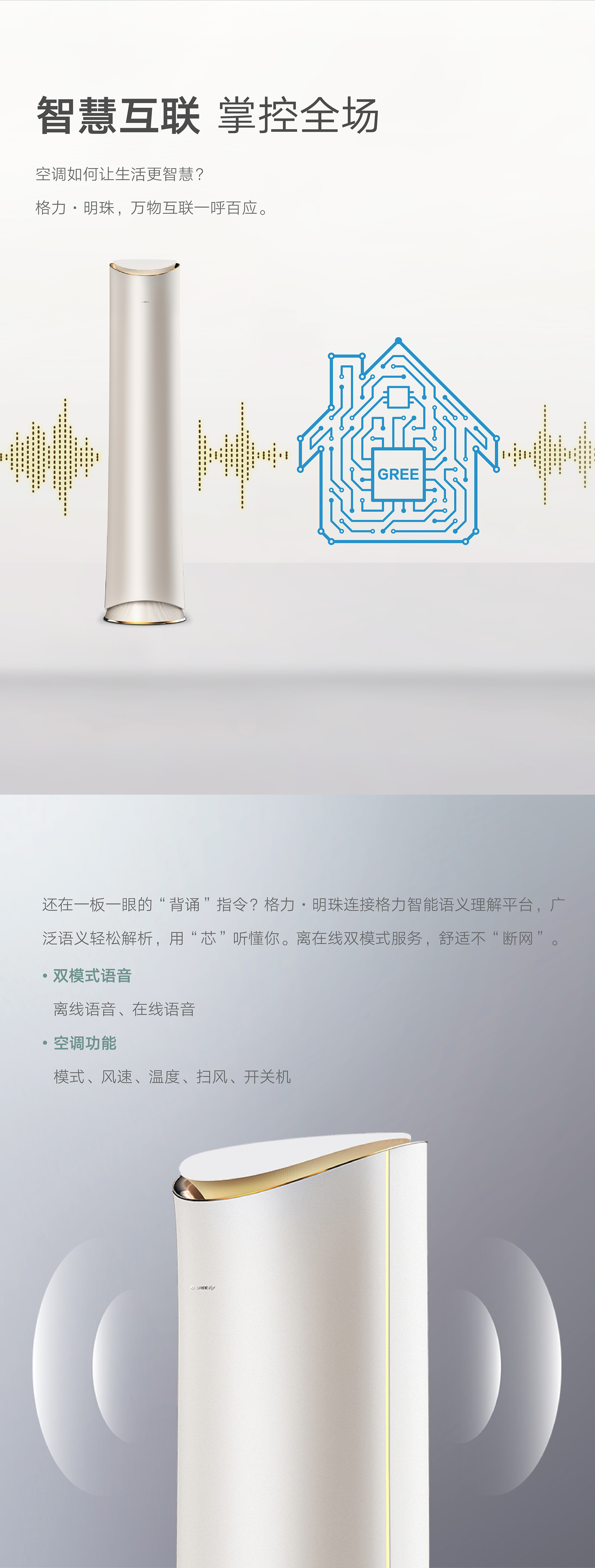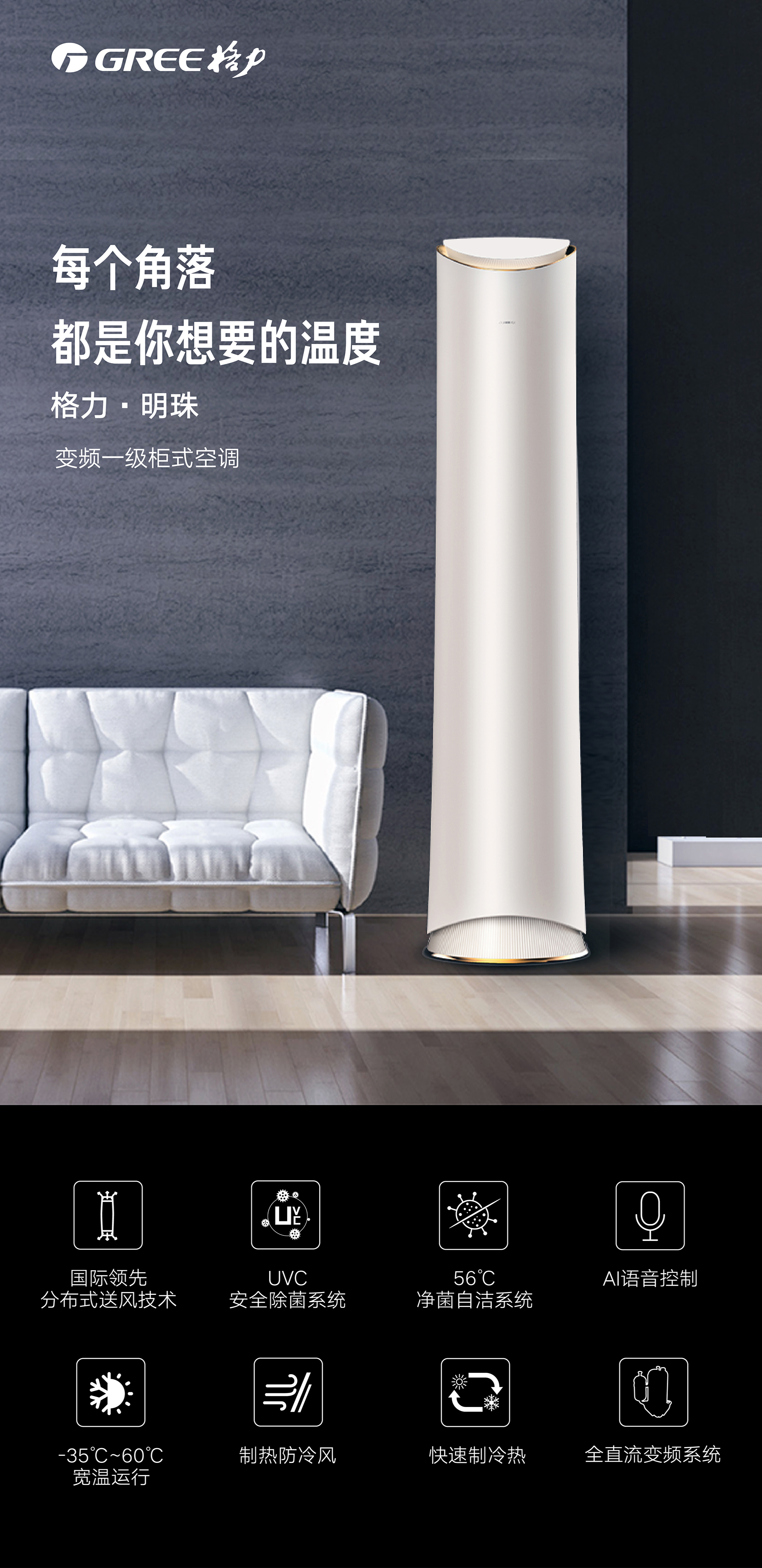 格力·明珠,明珠璀璨,风华绝代。国际领先分布式送风技术,每个角落都是你想要的温度。格力AI语音控制技术,言出即行。