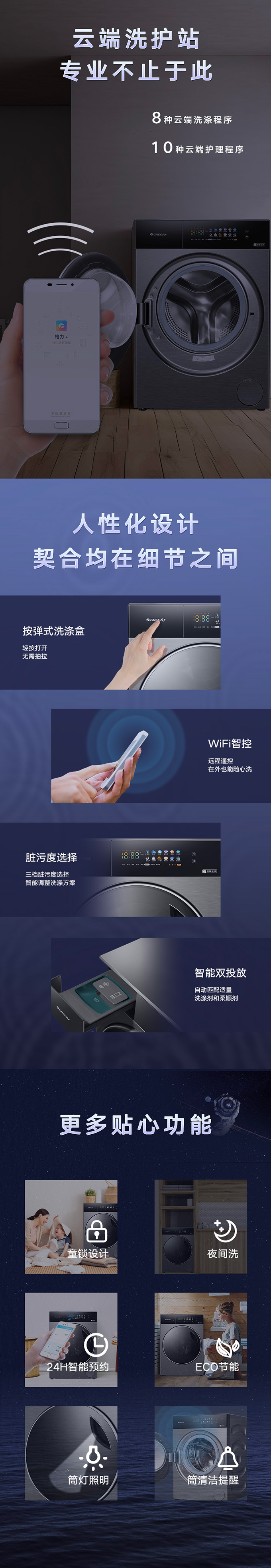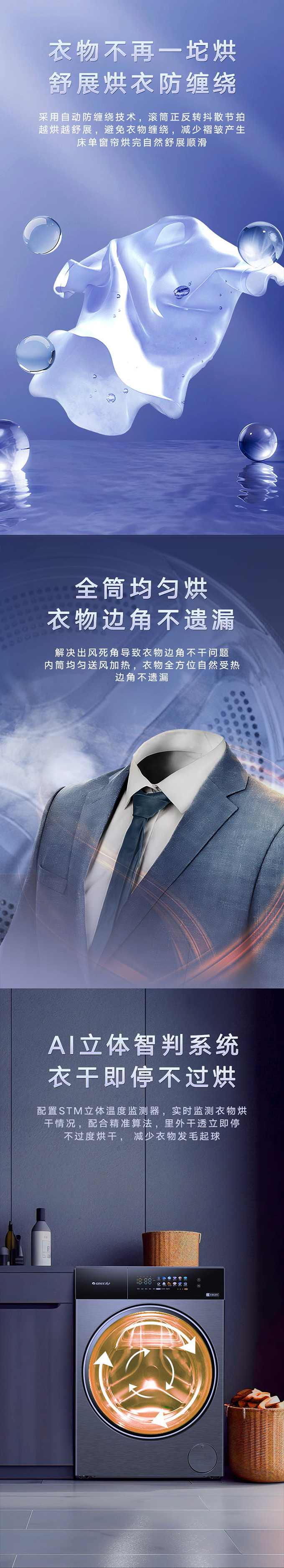 全域透气烘,衣物不在闷着烘。AI智能感应,脏污一键洗净。