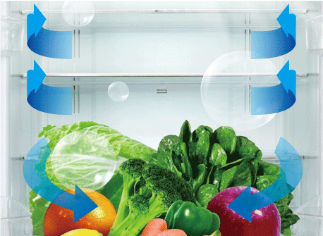 冷藏室多风道斜角出风设计,360°环抱送风,避免直吹风干果蔬。 |