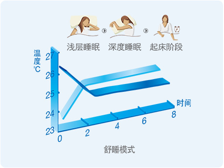 舒睡模式:贴合一般人体的体温节律,温度智能自动升高(制冷时)或降低(制热时),让您一觉睡到自然醒。